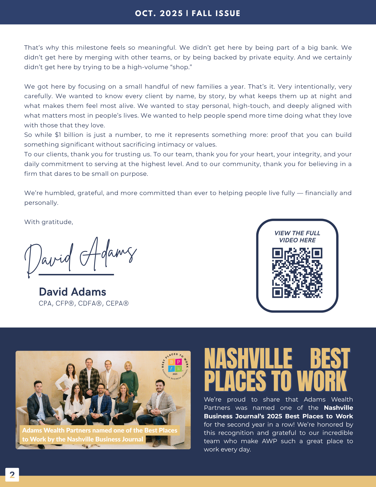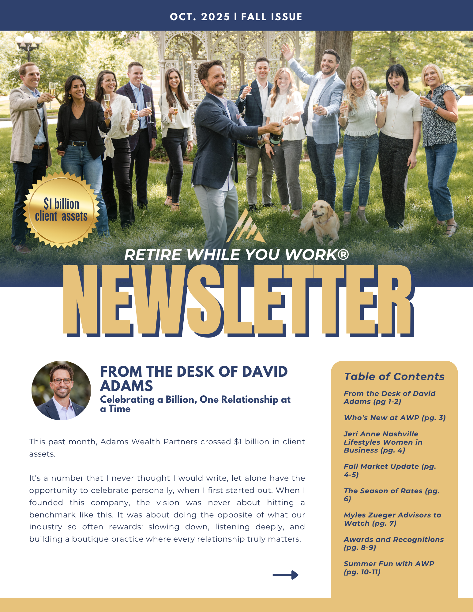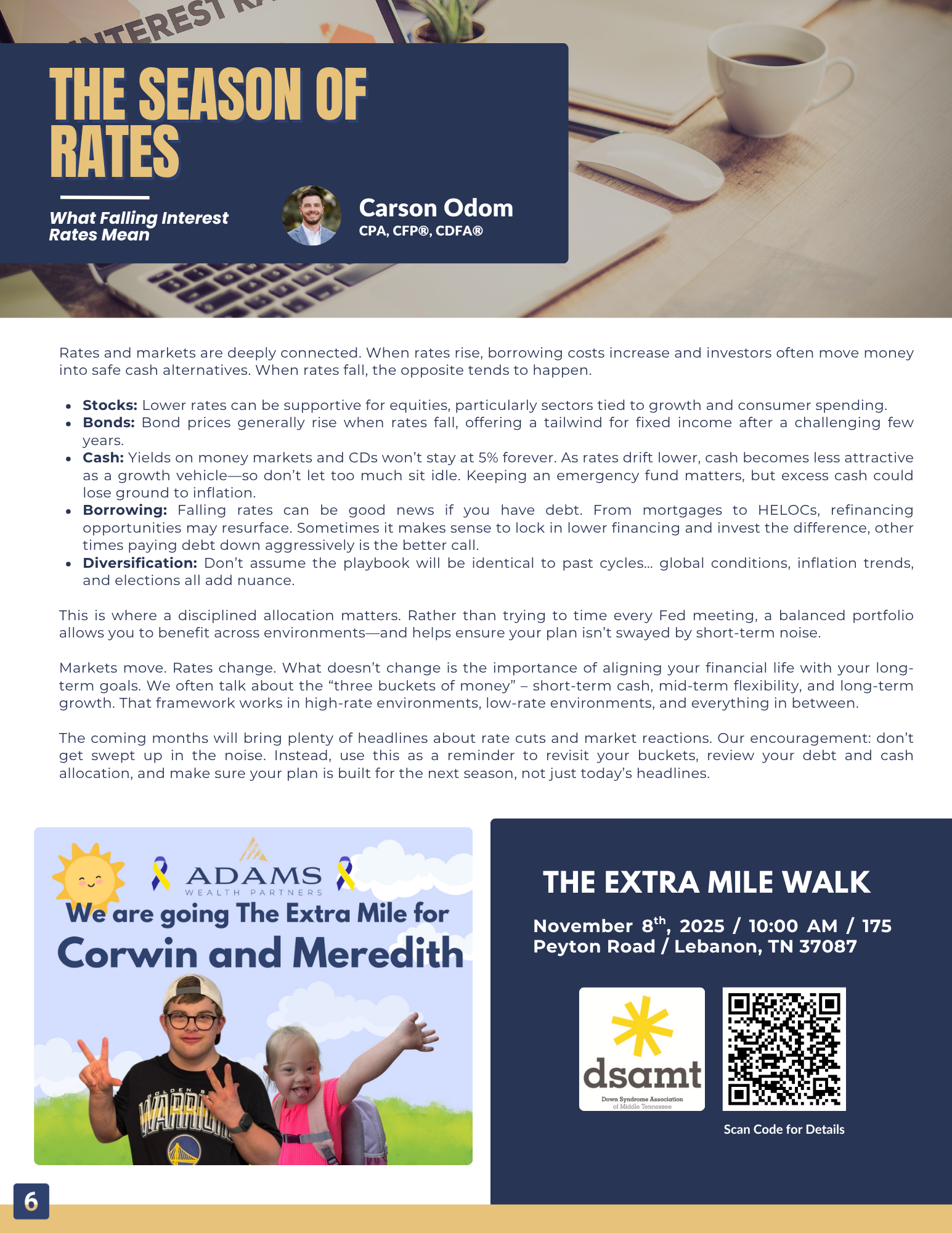 Certified Financial Planner Board of Standards Inc. owns the certification marks CFP®, CERTIFIED FINANCIAL PLANNER™, CFP® (with plaque design) and CFP® (with flame design) in the U.S., which it awards to individuals who successfully complete CFP Board's initial and ongoing certification requirements. CFP® holders at Adams Wealth Partners, LLC are: David Adams, Myles Zueger, Carson Odom, and Spencer Provow